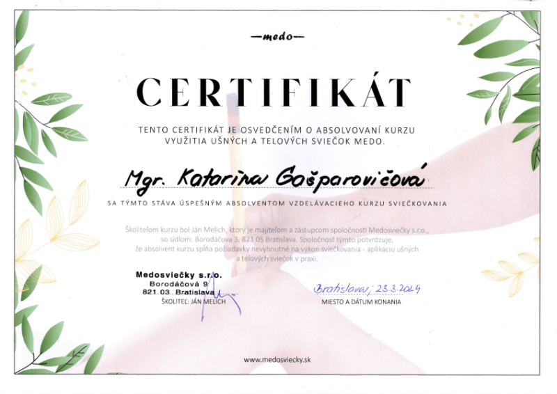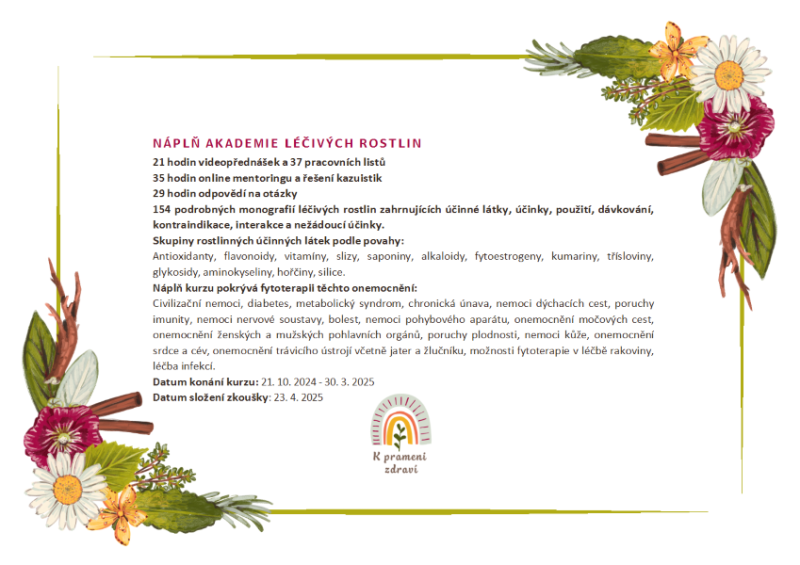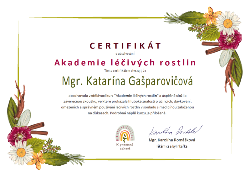- Certifikovaný Kurz Akademie léčivých rostlin pod záštitou Institut přírodního léčení v ČR