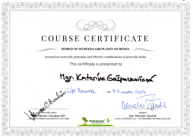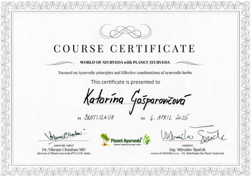 - Certifikovaný Kurz modulu AJURVÉDA Moje zdravie, Moja profesia na Škole ajurvédy v Bratislave garantovaná Slovenskou asociáciou ajurvédy, Európskej ajurvédskej asociácie a Professional European Ayurvedic centre of Excellence